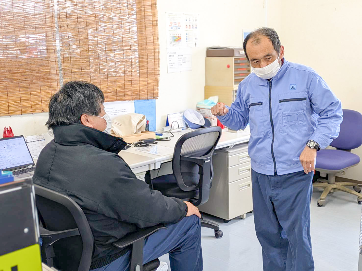朝は、長袖長ズボンの作業服に着替え、身だしなみを整えてからワークを出発。