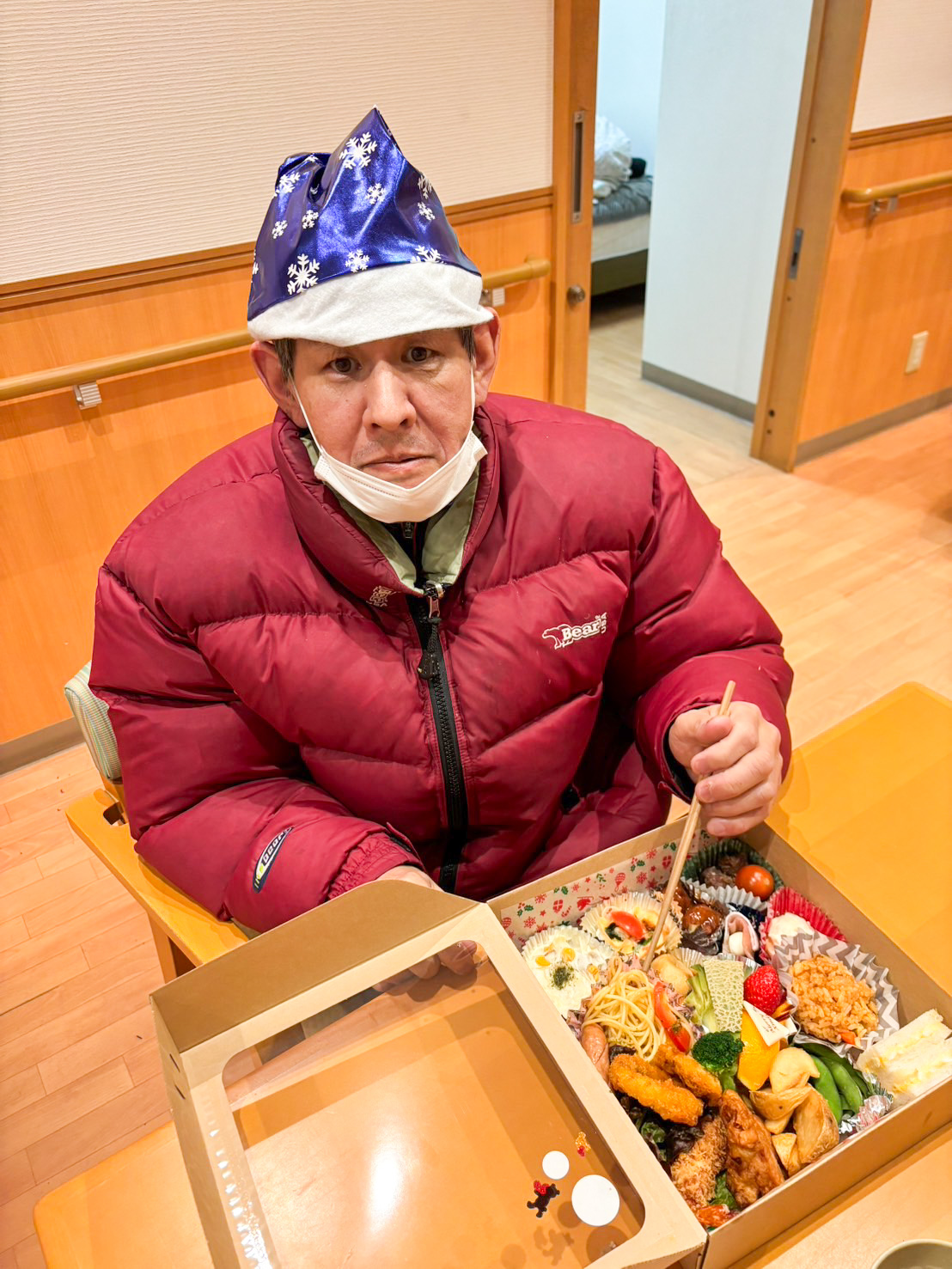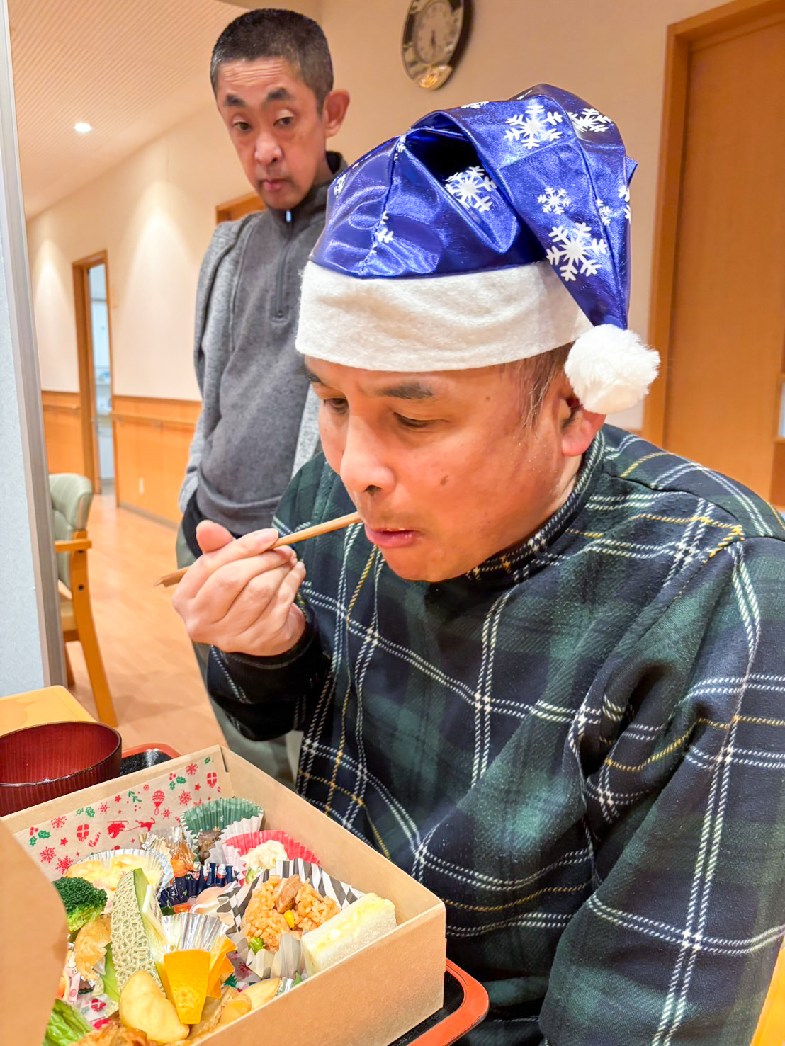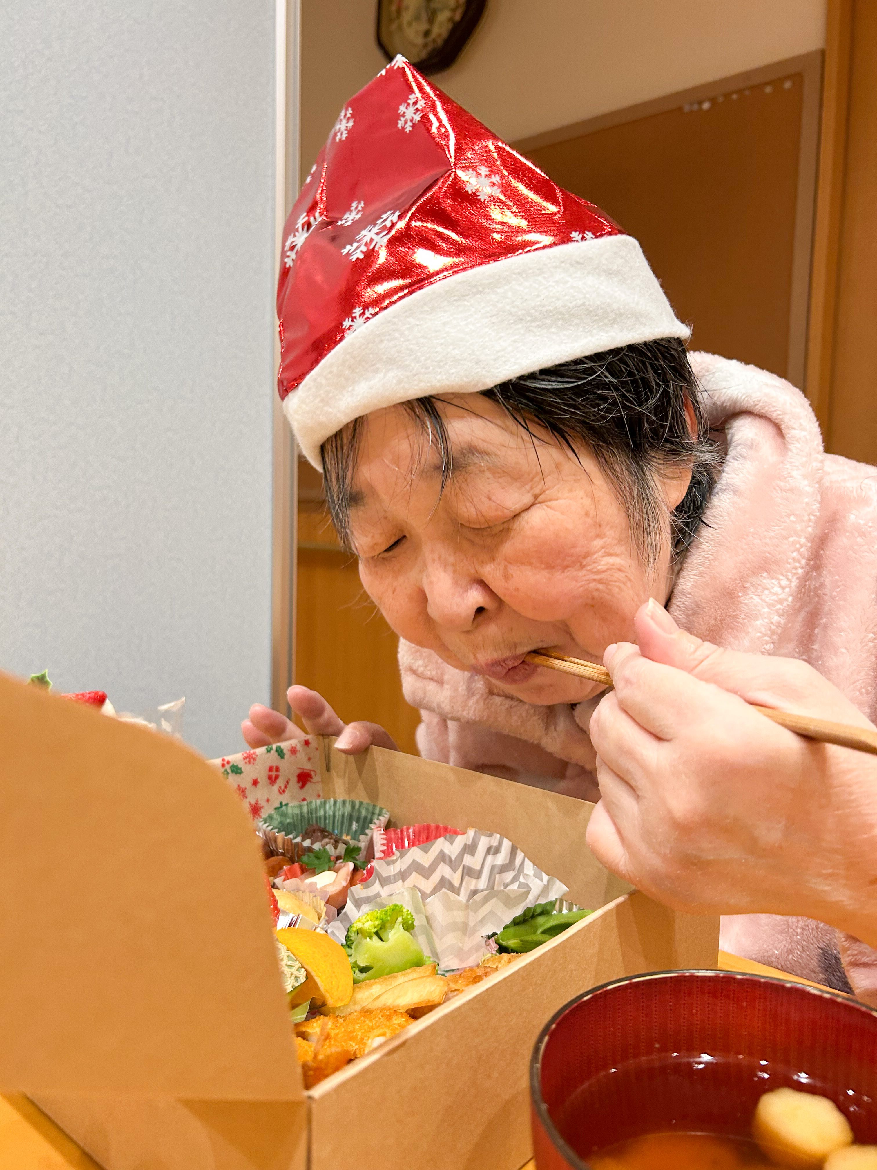運ばれてきた食事を見て「わ~美味しそうじゃな」「イカの揚げたのが入っとるな」と大喜びでした。
